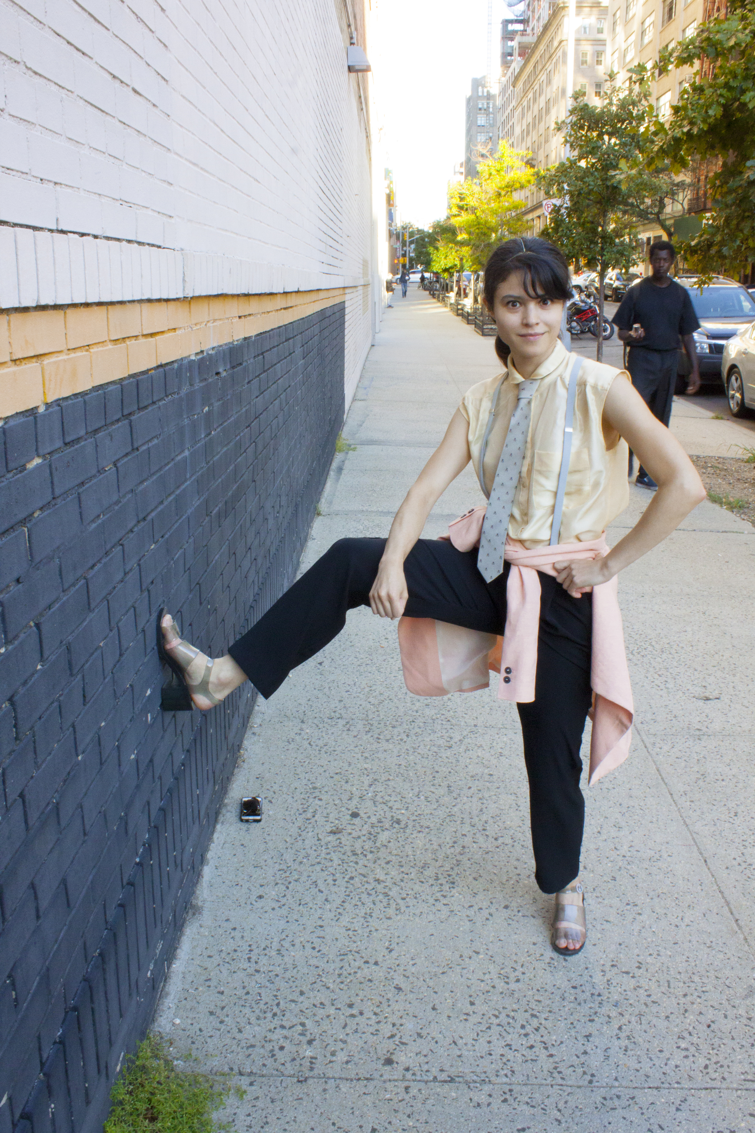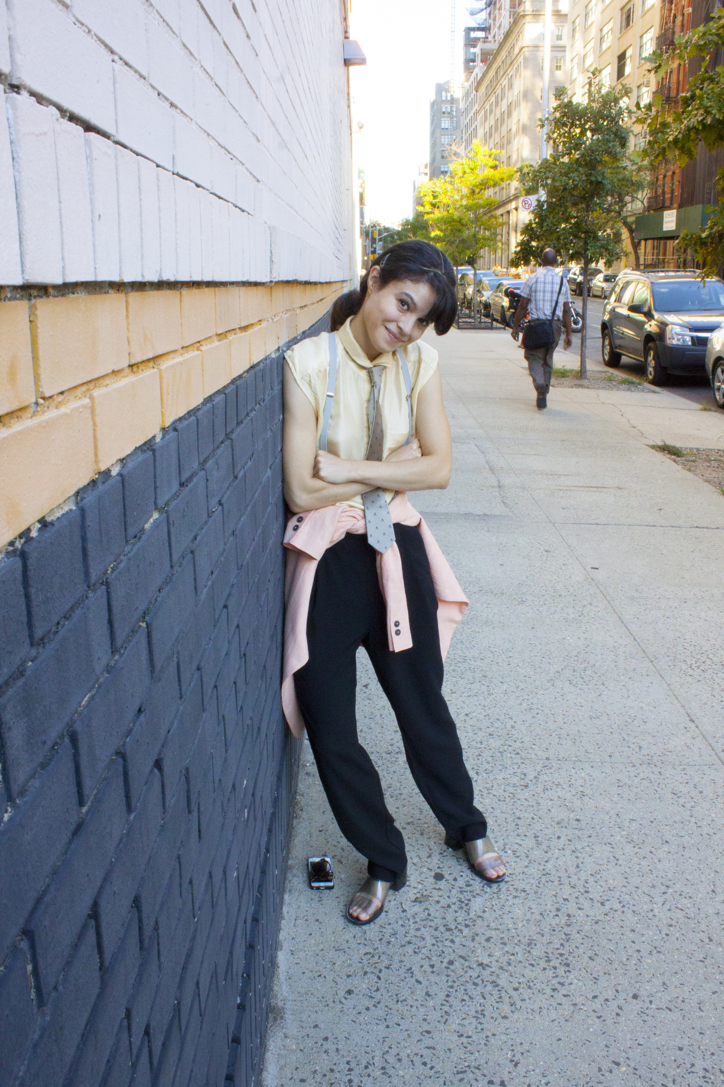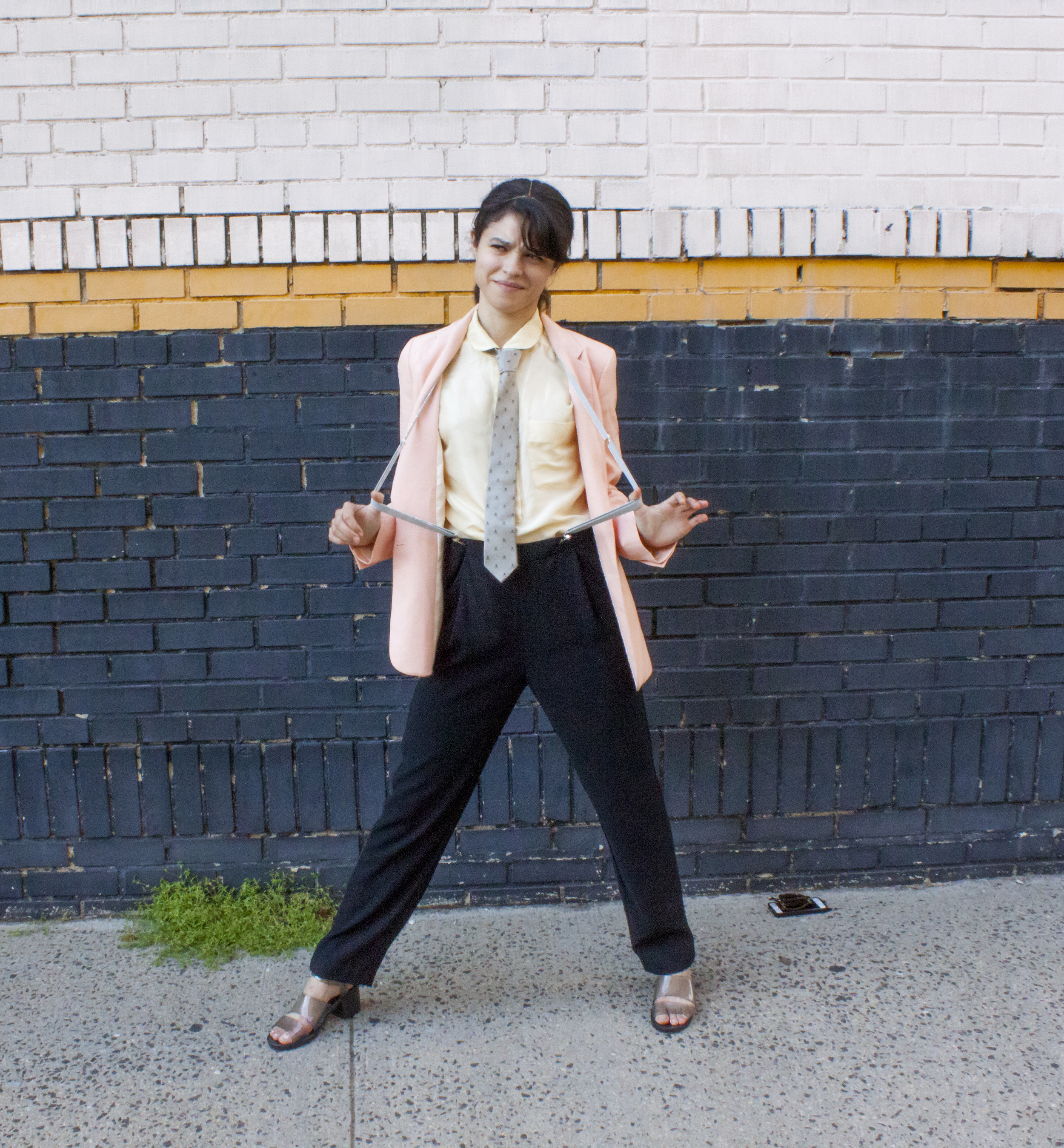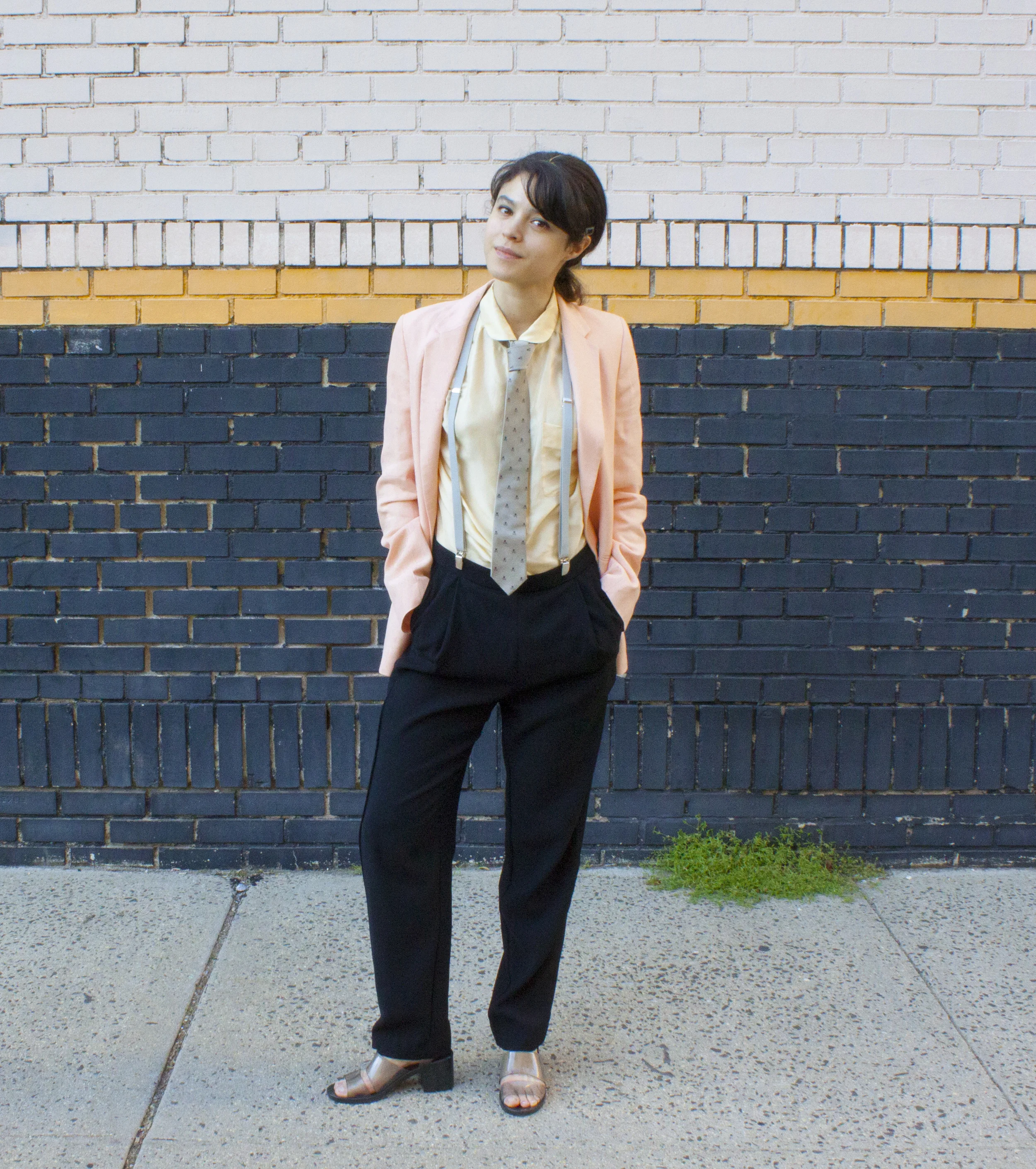 Head wrap made BY ME, Zara linen blazer, J. Crew silk top, Crewcuts silk skull tie, Marc by Marc Jacobs suspenders, Mango pants, American Apparel PVC shoes, because glass is a liability.