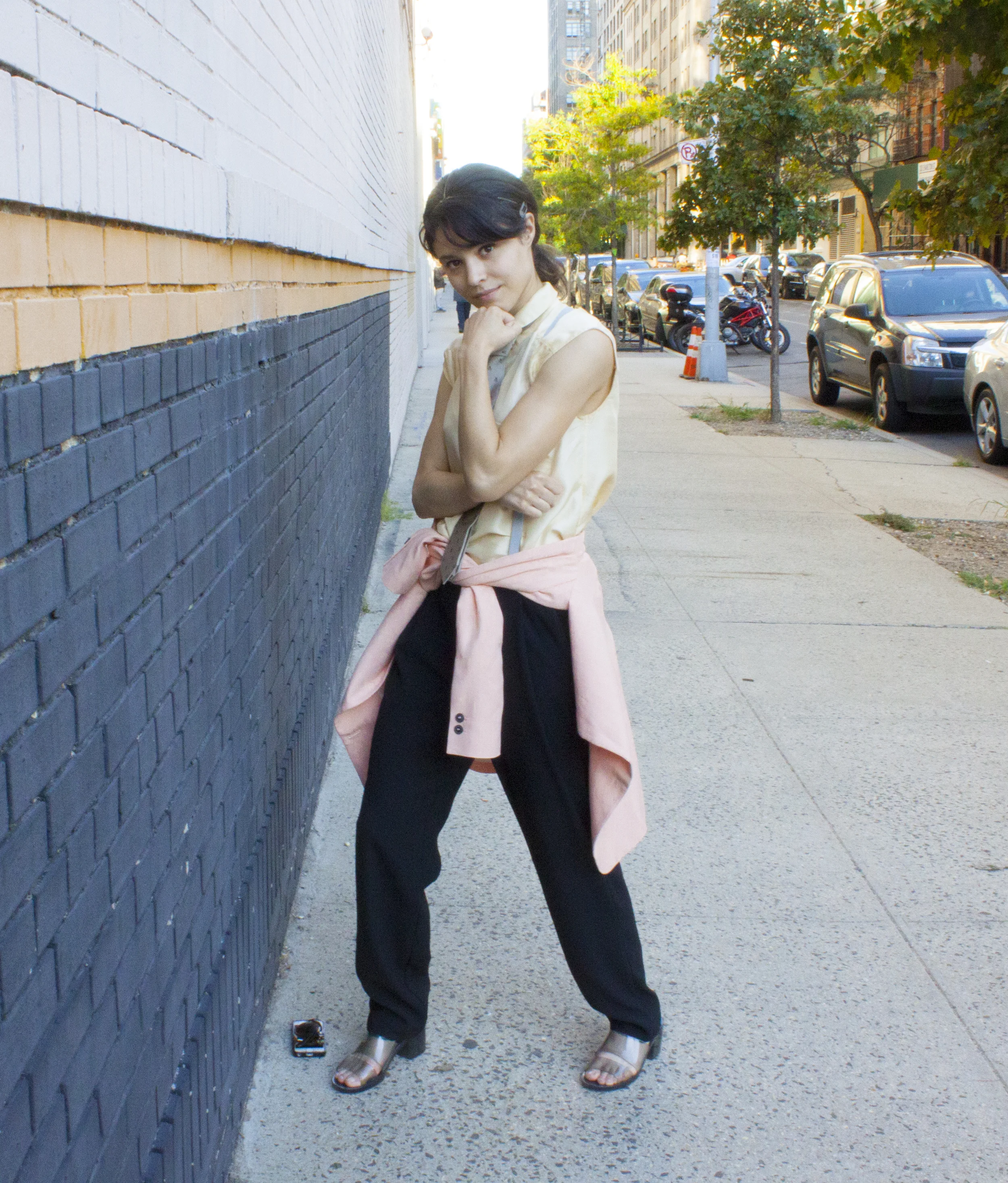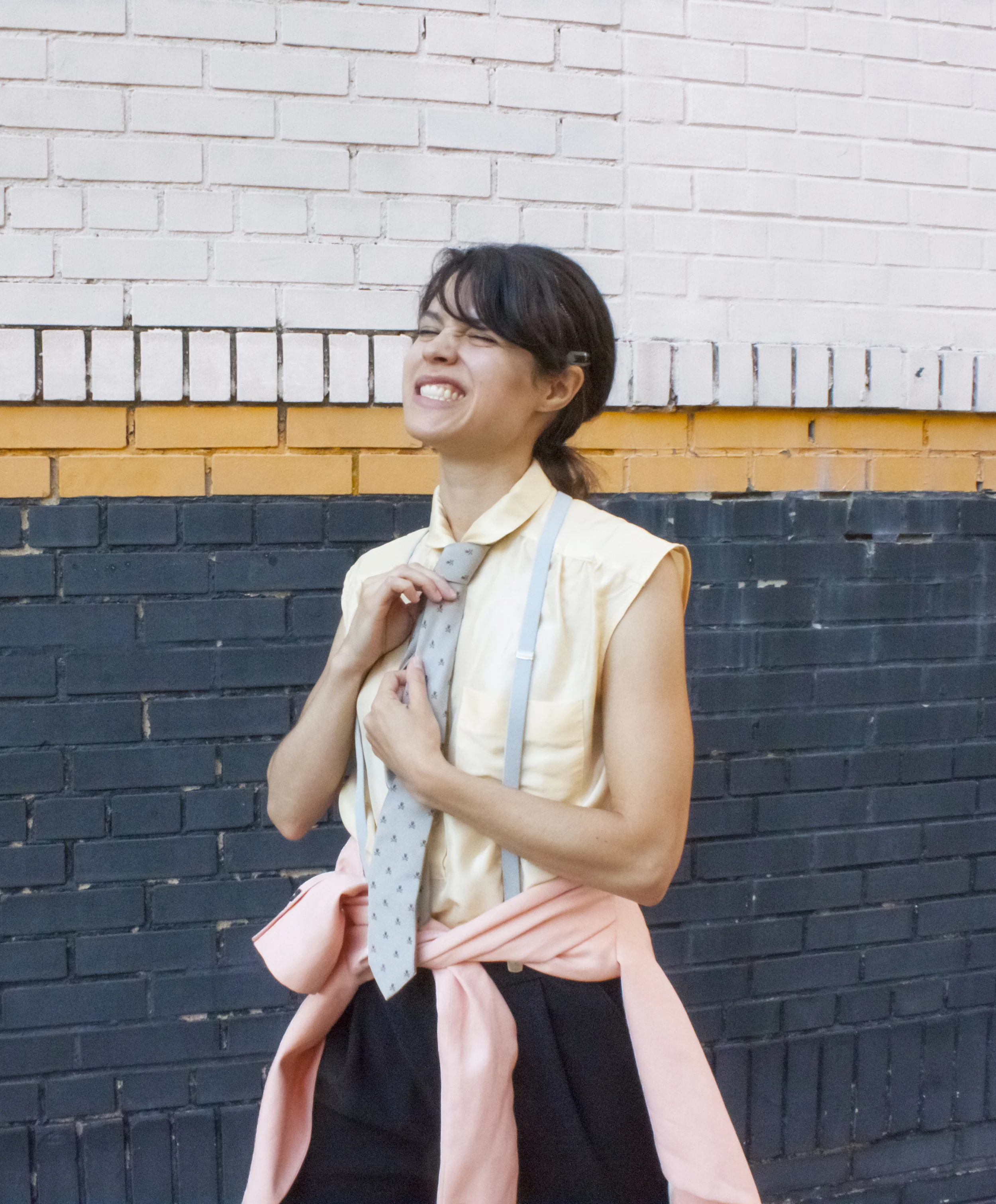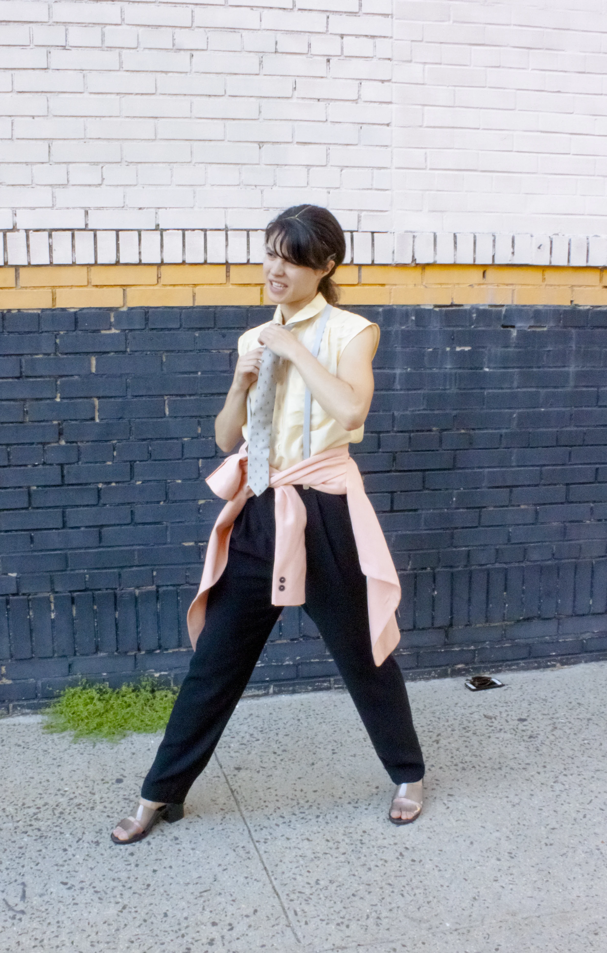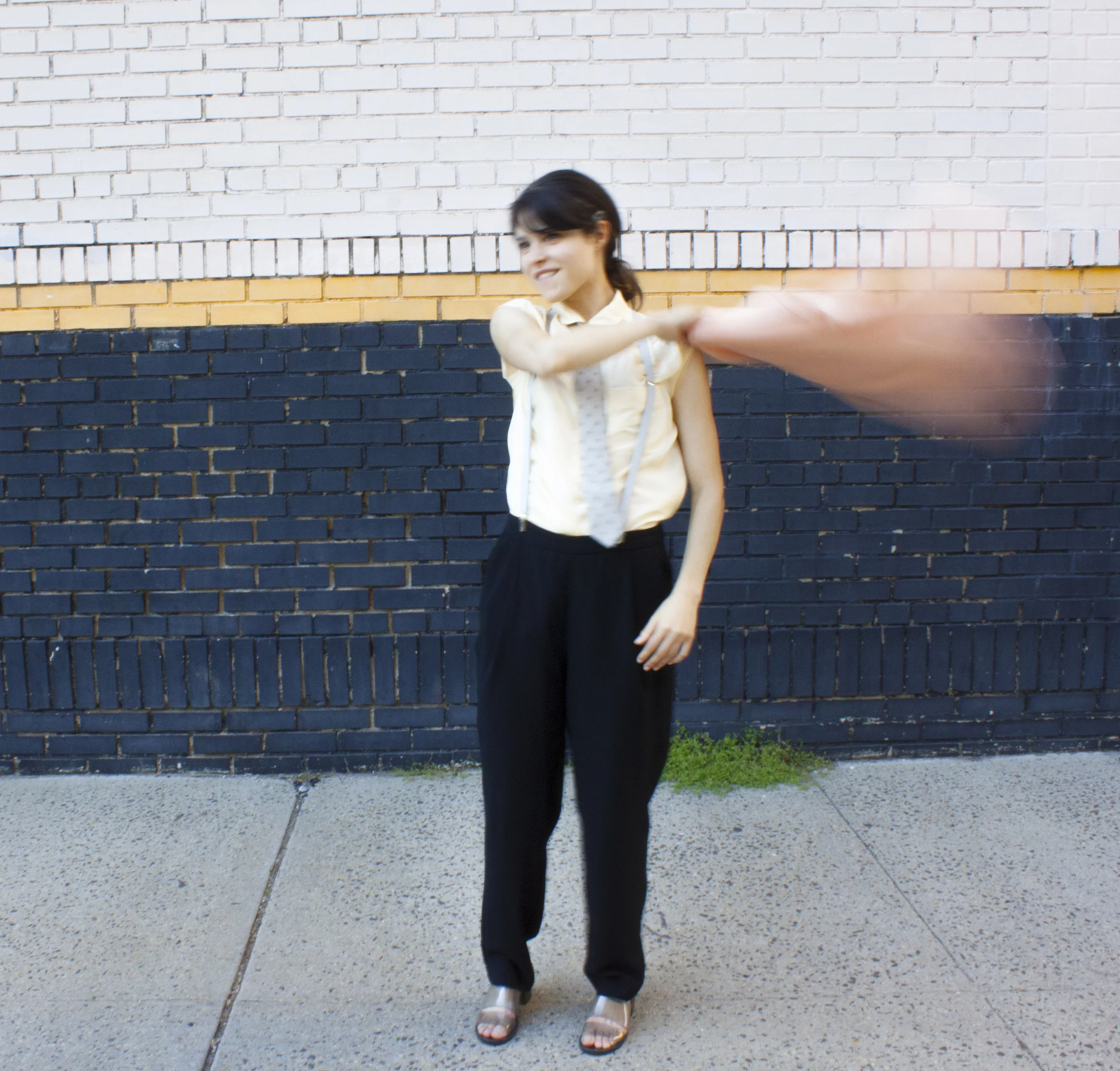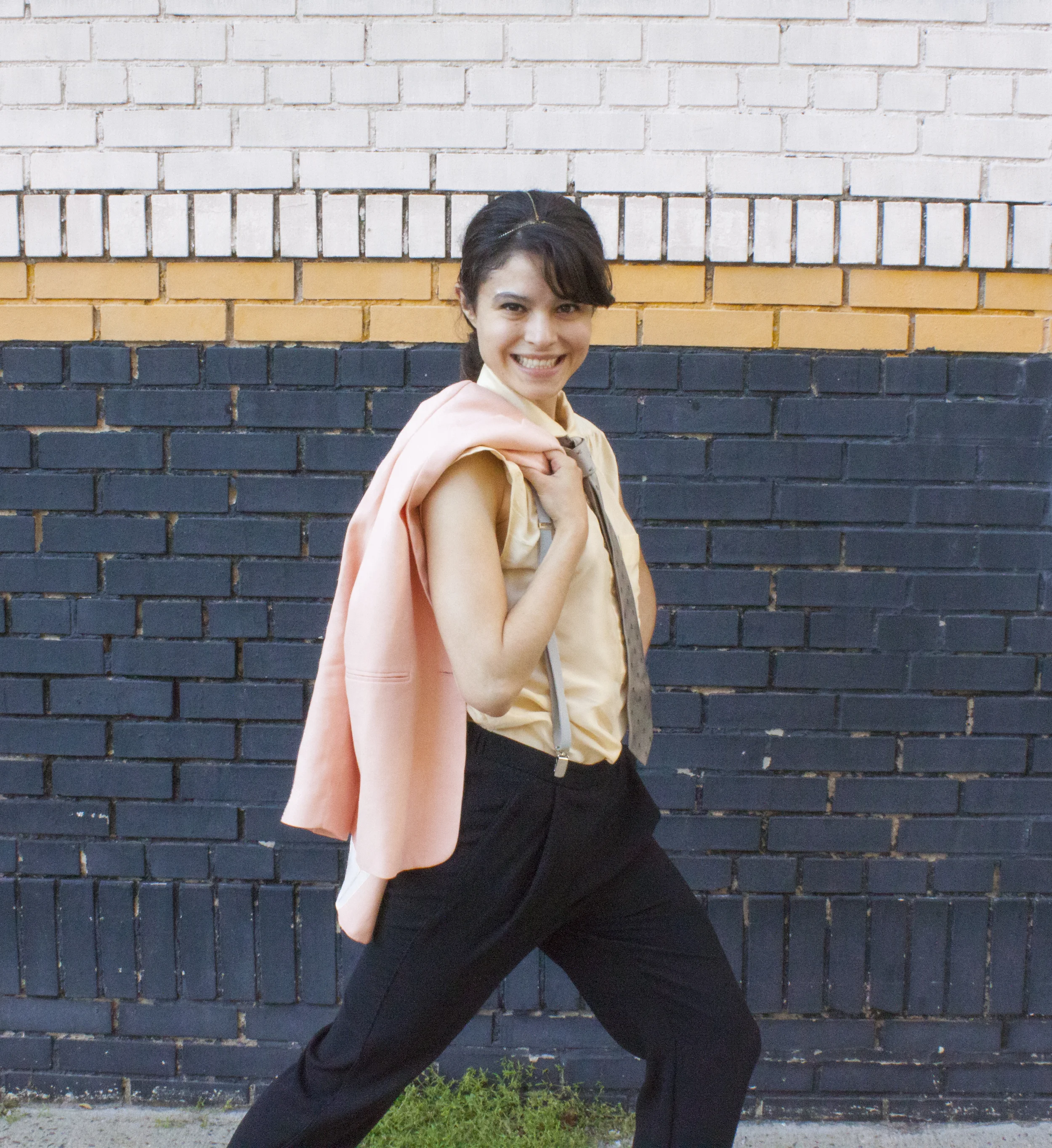 Head wrap made BY ME, Zara linen blazer, J. Crew silk top, Crewcuts silk skull tie, Marc by Marc Jacobs suspenders, Mango pants, American Apparel PVC shoes, because glass is a liability.
