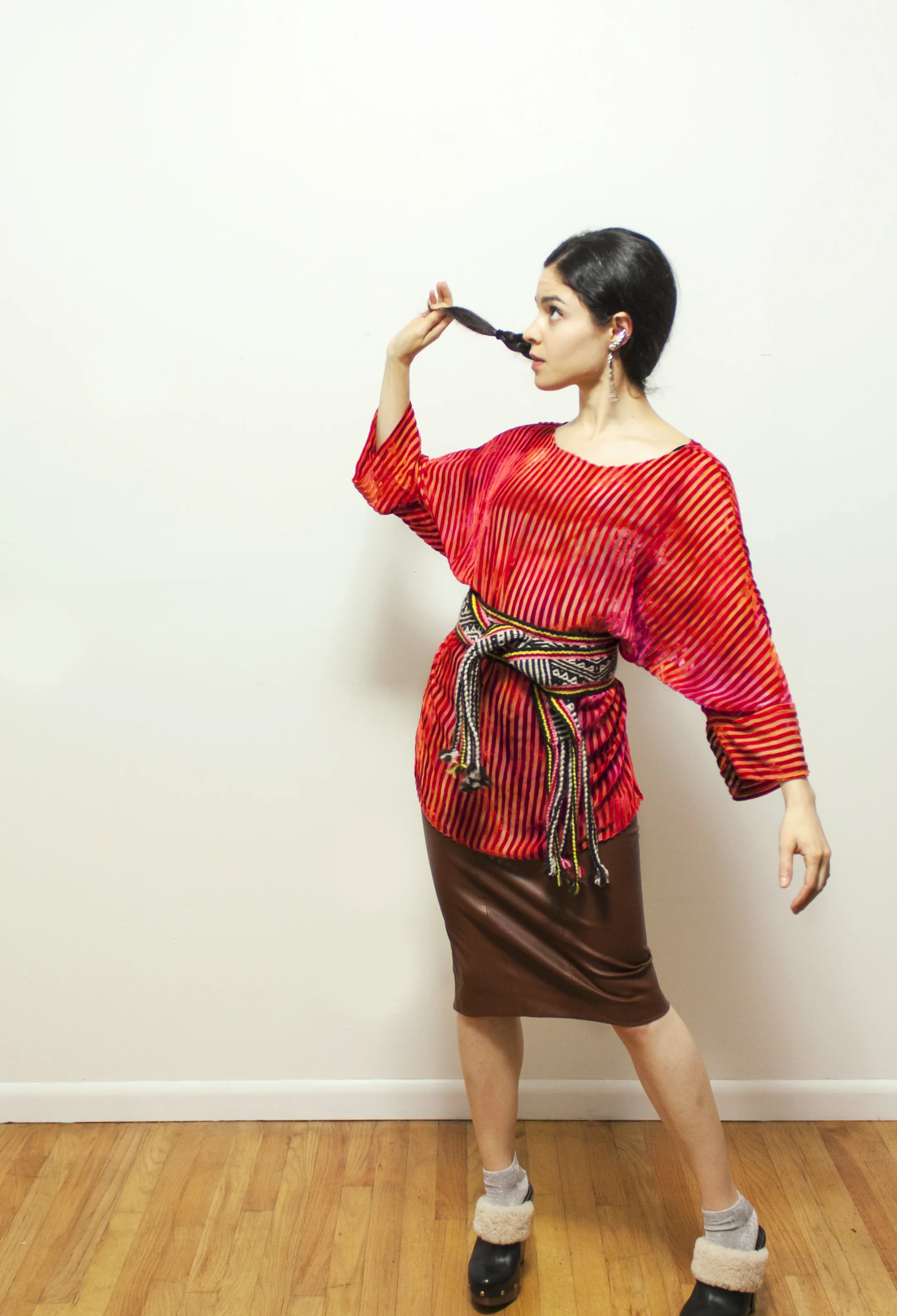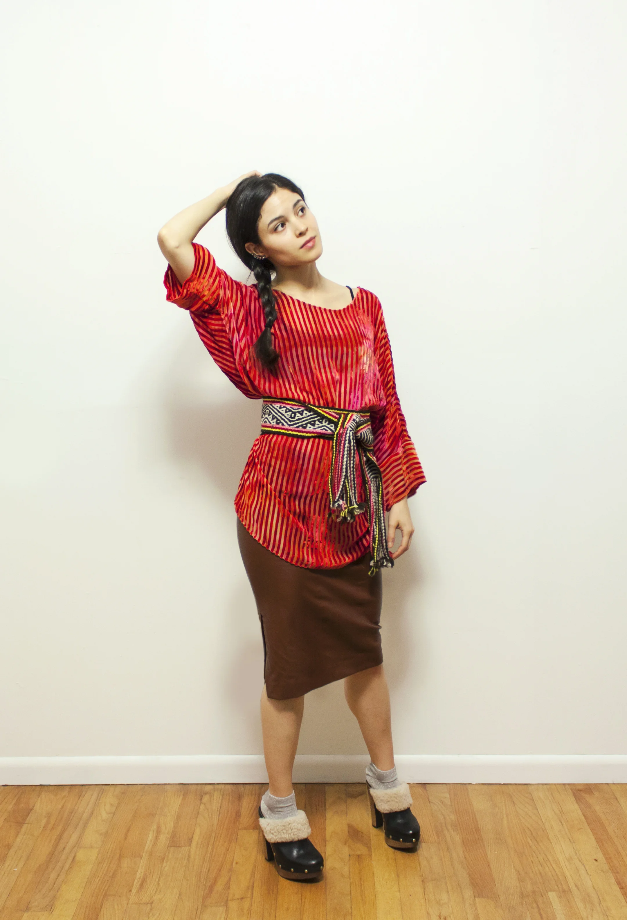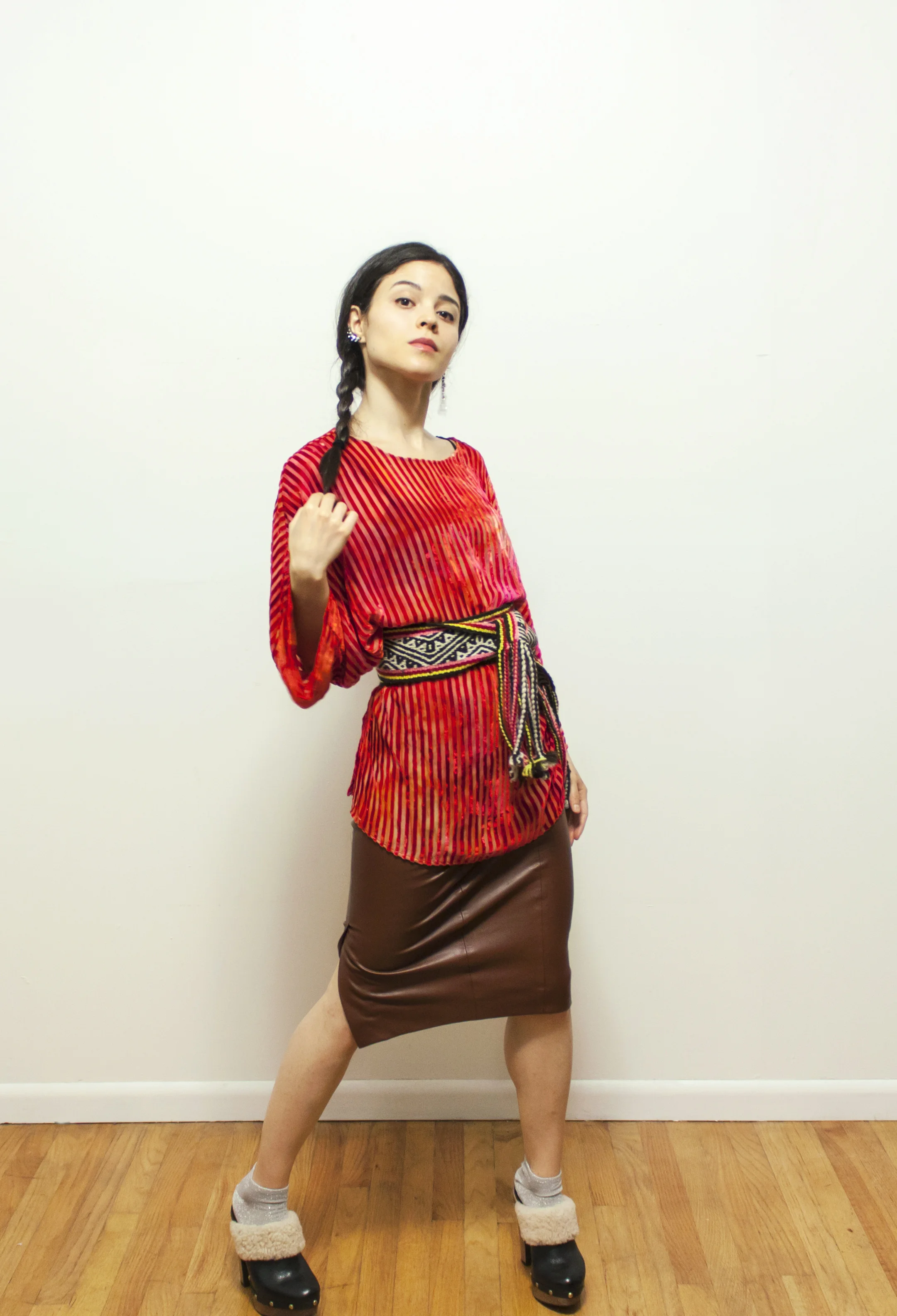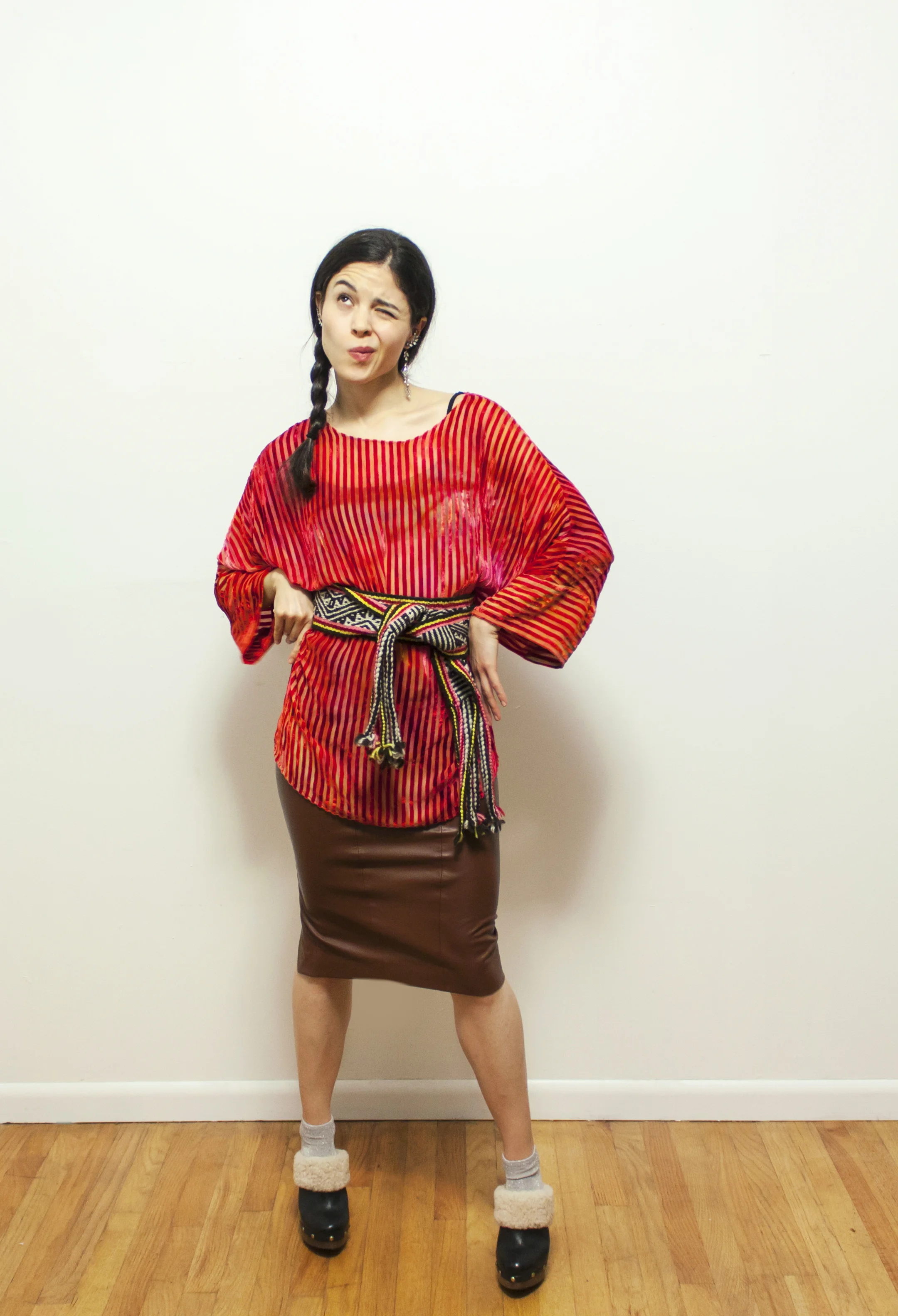Vintage Sandra Rubel silk-velvet top; Zara faux leather skirt, glitter socks, and earrings; Topshop clogs; Vintage belt.
