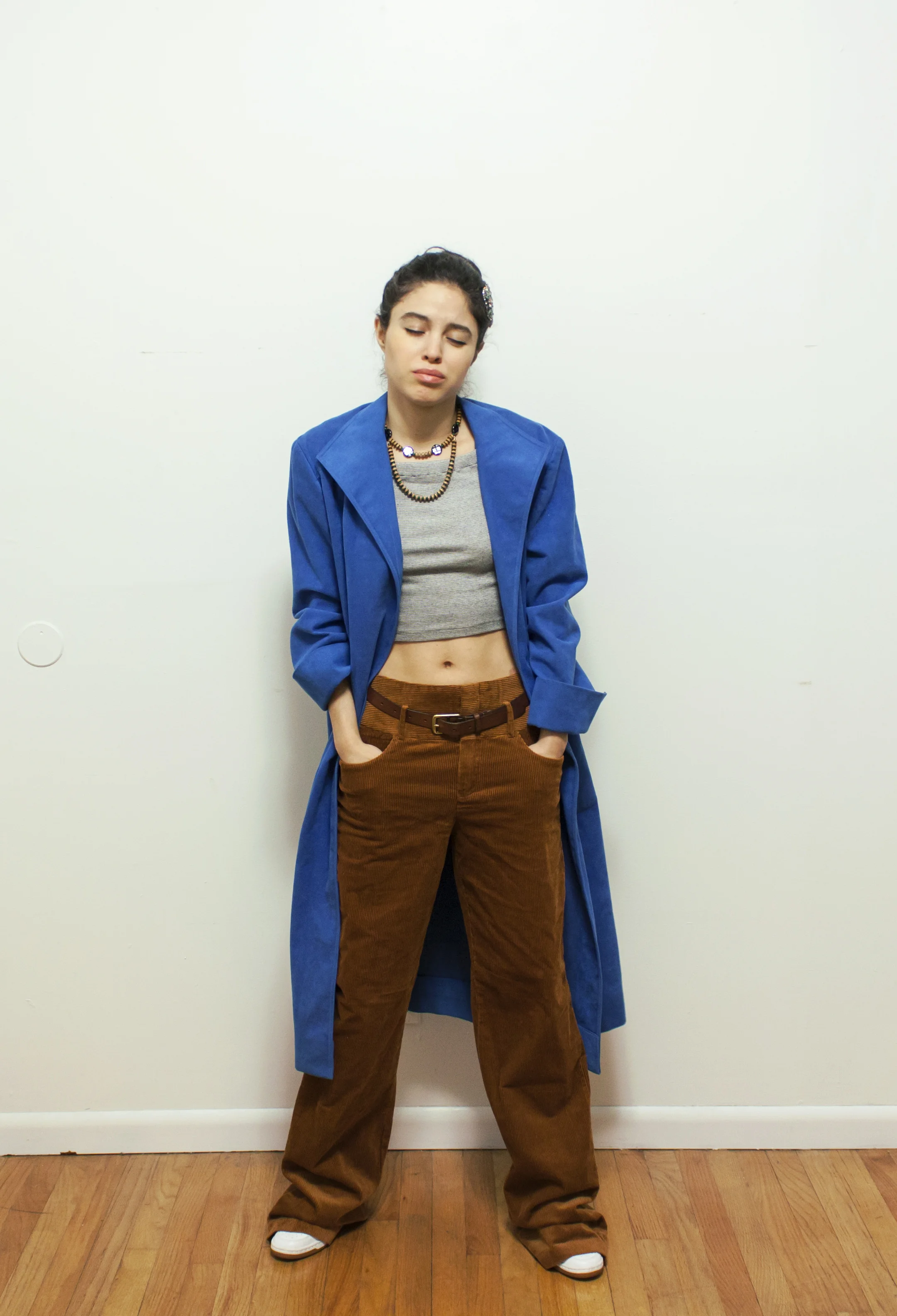 Zara top, pants, and hair accessories; Retropolis Vintage suede trench; J. Crew belt; Nike sneakers; handmade necklace by moi.