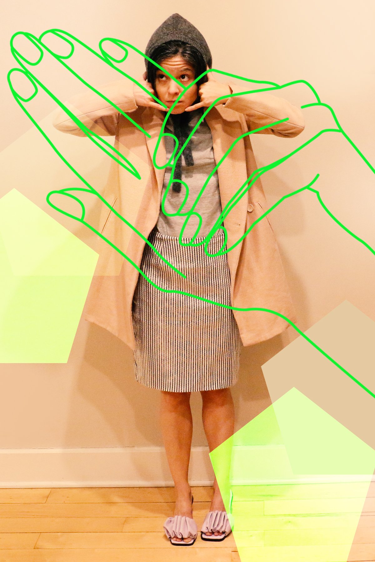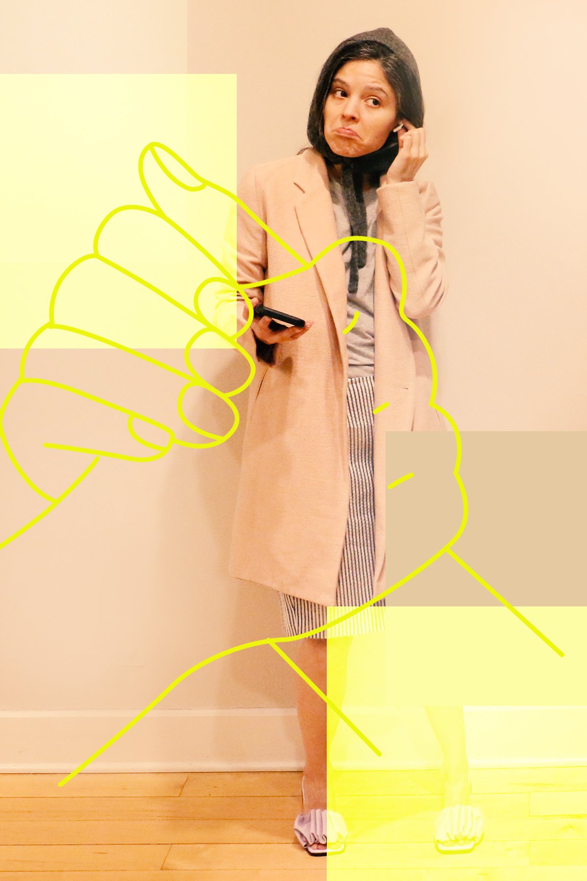 But it made me think of our hands and how when I was growing up, there was a universally recognized way to mimic speaking on the phone, which for the majority of my childhood and teenagehood involved a landline. Your index, middle, and ring finger were bowed down into your palm, with your pinky and thumb stretched out in opposite directions—your thumb was pressed against your ear, and your pinky served as a receptacle for the words about to be spoken by your mouth. Talking on the phone was an activity that required being at a specific place, at a specific time, to do a specific thing. Sometimes you planned for it, sometimes you didn’t, but very often it broke up the monotony of the day. Over time and with the growing presence of cellphones, the sign for talking on the phone changed from hang-ten to the vise-grip we’re all so wearily familiar with. I marked this transformation most when the people around me started having children, and I watched with horror and fascination as they impersonated their parents by cupping their hands around their ears and speaking into their wrists. It was a brand new world.